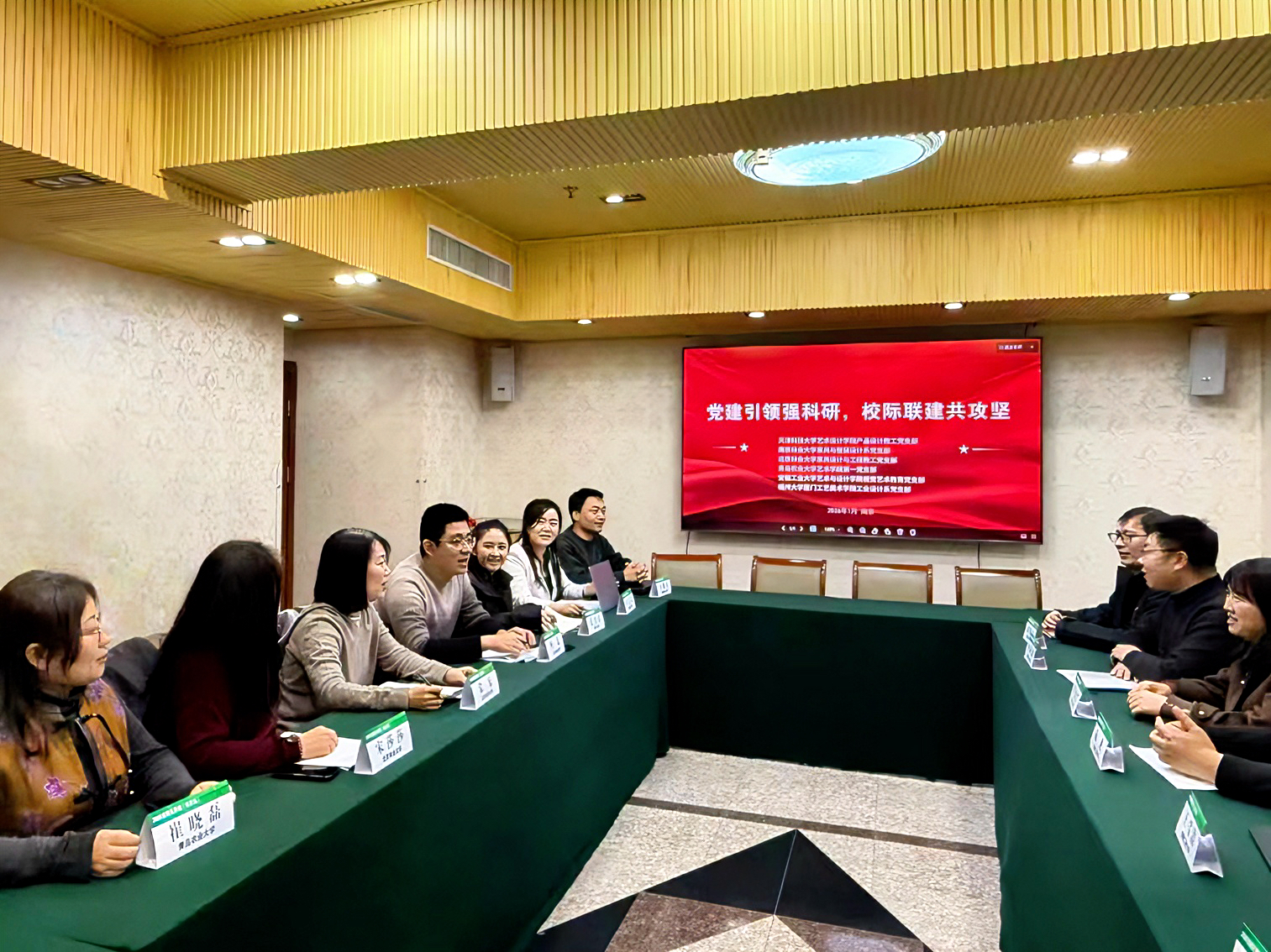 本次活动由天津科技大学艺术设计公司产品设计教工党支部发起,联合南京林业大学家居与工业设计公司家具与整装设计系党支部、北京林业大学材料科学与技术公司家具设计与工程教工党支部、公司第一(教工)党支部、安徽工业大学艺术与设计公司视觉艺术教育党支部、福建大学厦门工艺美术公司工业设计系党支部共同参与。与会代表围绕设计学科前沿、国家重大需求以及科研项目联合申报等议题开展了深入研讨。