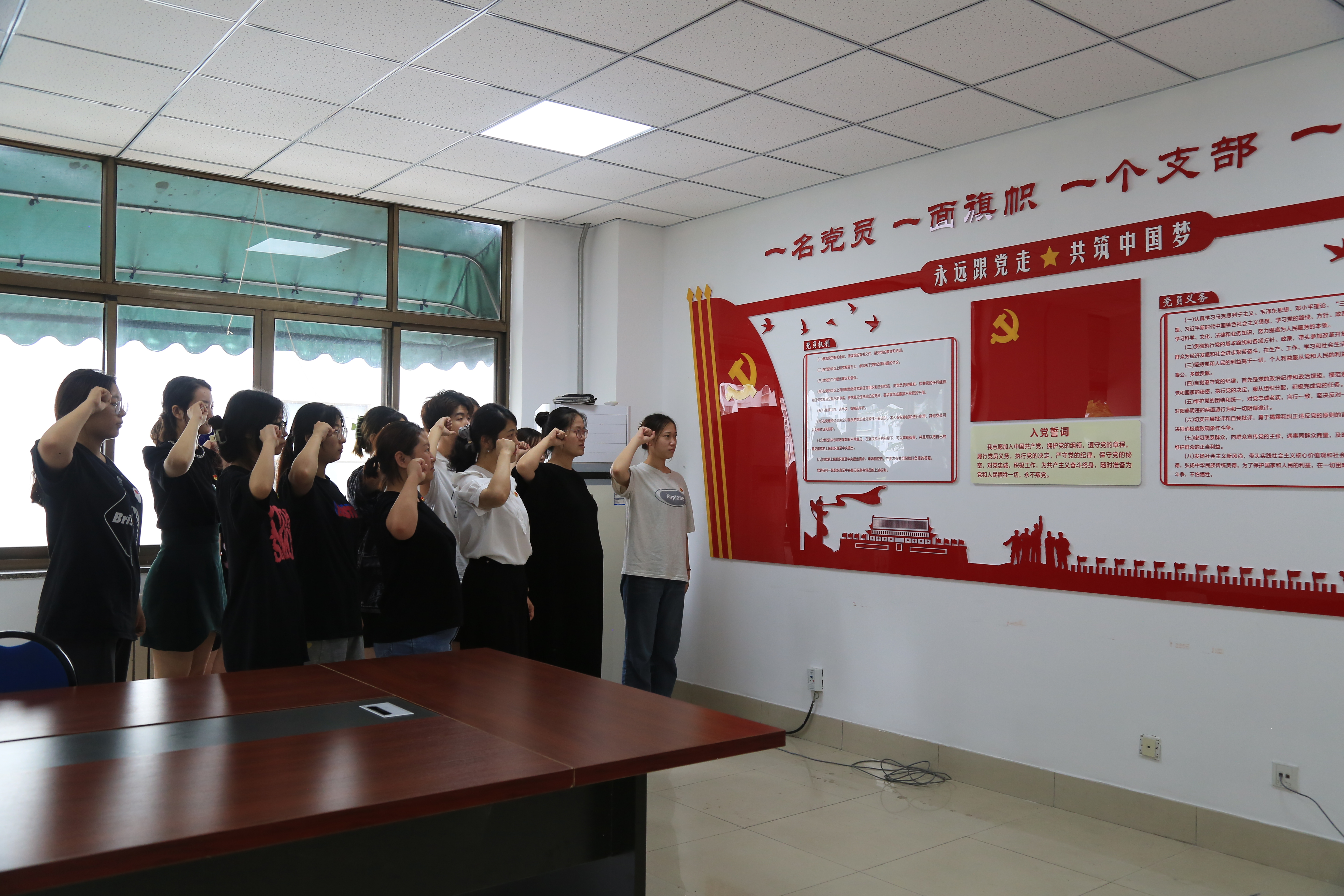 党课结束后,全体党员在党建活动室举起右拳,面向党旗庄严宣誓。全体在校师生党员参加活动,部分入党积极分子参加了党课学习。