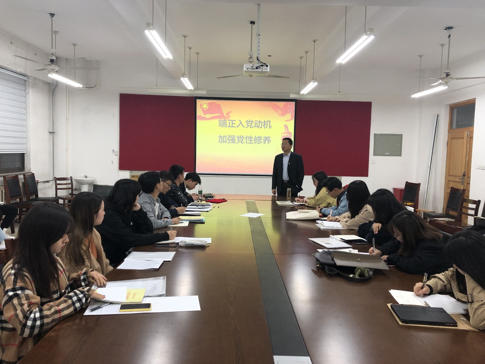他强调,老员工申请加入党组织,要深入剖析自己的入党动机是否端正,理想信念是否坚定,是否认同党的纲领。要切实做到加强理论学习、提升理论修养,敢于直面问题、勇于接受监督批评,传承优秀文化、弘扬党的优良传统,尽快达到党组织对个人申请入党的思想要求,做到思想上真正入党。他要求同学们坚定对党的理想信念的高度信仰,正确理解好思想上、政治上和组织上入党的内涵,严守党的政治纪律和政治规矩,做到政治上真正入党,用“四讲四有”合格党员的标准来要求和规范自己,牢记入党誓词,牢记使命勇担当,不忘初心求发展,做到行动上的真正入党。