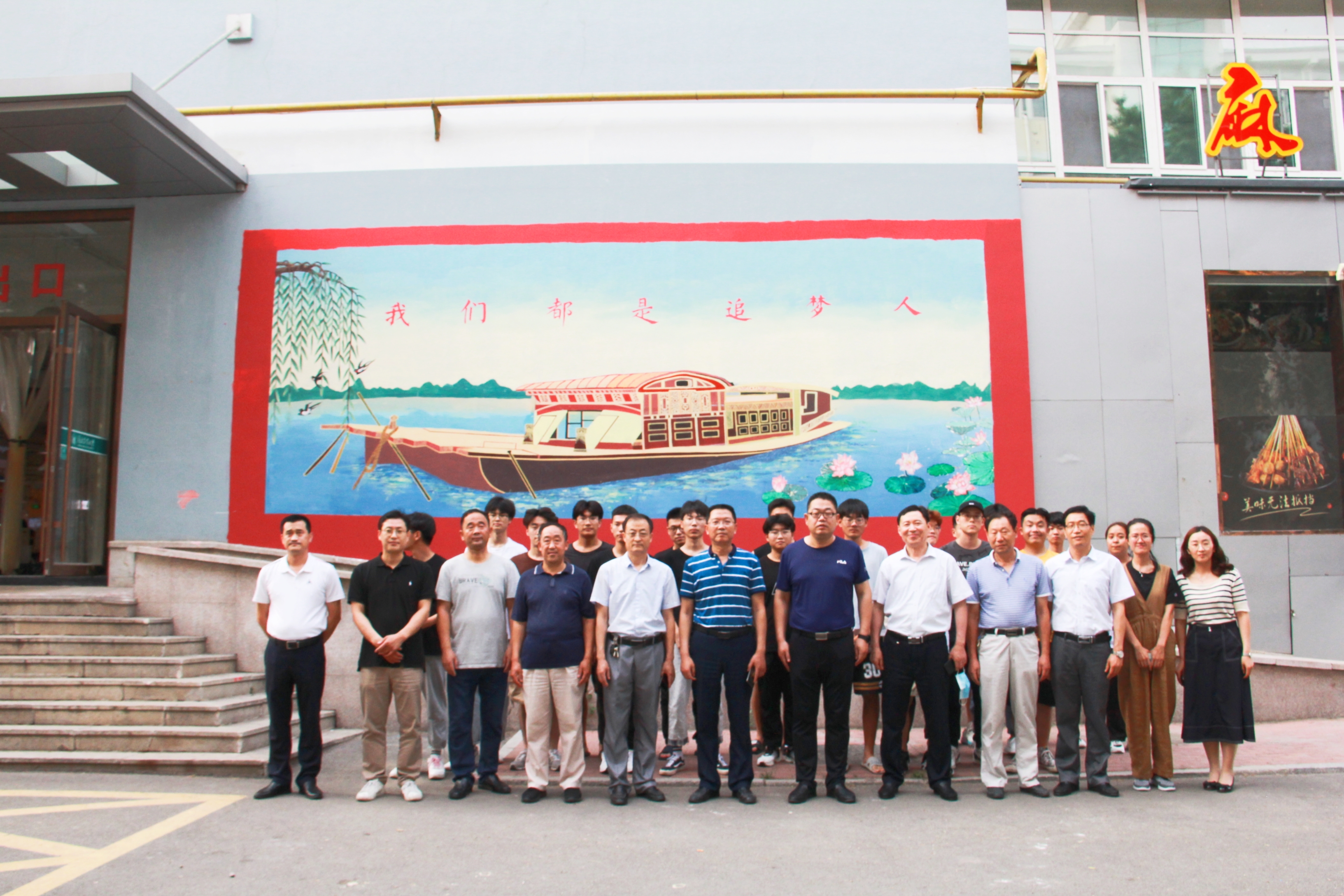 经公司相关部门批准,本次彩绘选取海都餐厅南门附近的两块空白墙面进行创作,灵活利用空间美化了校园环境。创作中,同学们反复构思、选图,最终经师生共同讨论,选取了展现“中共一大”会议地点上海市兴业路76号石库门和嘉兴南湖红船的两幅图案进行墙绘创作,展示中国共产党百年历程的精神源泉。绘画期间,同学们分组在墙体上打稿、勾线、调色、上色,整个过程有条不紊、井然有序,用独特方式向党的百年华诞献礼、度过了一个有意义的节日。不少经过师生拍照打卡,或者相约同学好友前往观看。