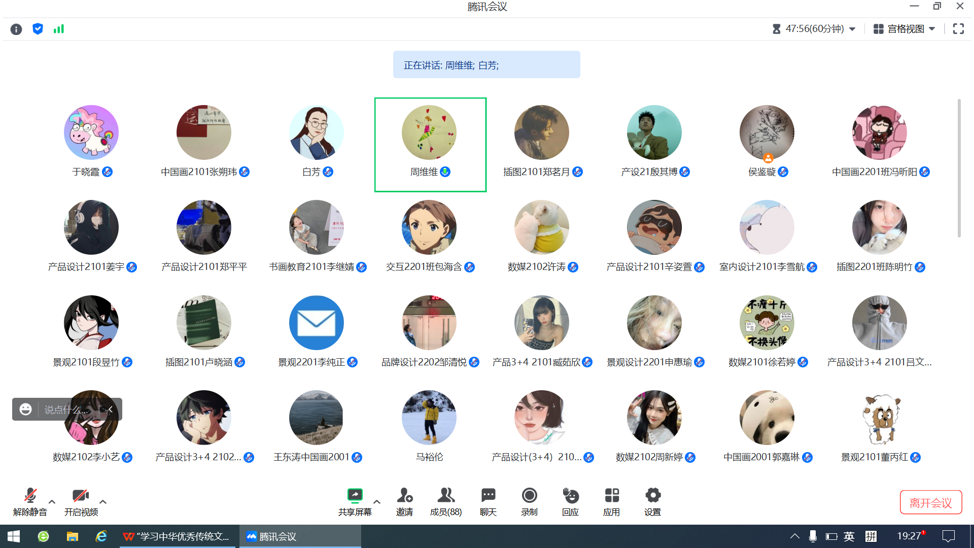 辅导员白芳领学了习近平总书记在北京出席文化传承发展座谈会时发表的重要讲话。大家认真学习并表示,牢记习近平总书记嘱托,发挥专业优势,努力担当推动文化繁荣、建设文化强国、建设中华民族现代文明文化使命,早日投身推动中华优秀传统文化创造性转化、创新性发展。