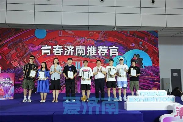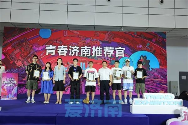 团市委学少部部长董玲和爱济南客户端总经理卞思杰为当代潮流艺术家戴大山,M26D品牌主理人徐卿,杭州速体贸易有限公司总经理、资深球衣收藏家黄曰,中国青年舞蹈编导、中国艺术研究与北京电影公司创作肢体戏剧导演0531主理人邢龙,自由插画师、潮流插画艺术家于光源,潮流插画艺术家匡莉,抖音粉丝第一球鞋博主郭彦博颁发“青春济南推荐官”聘书。