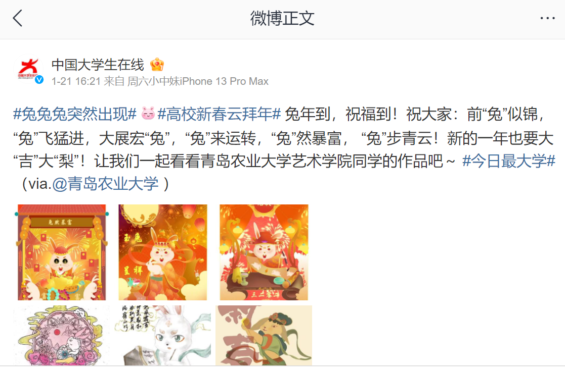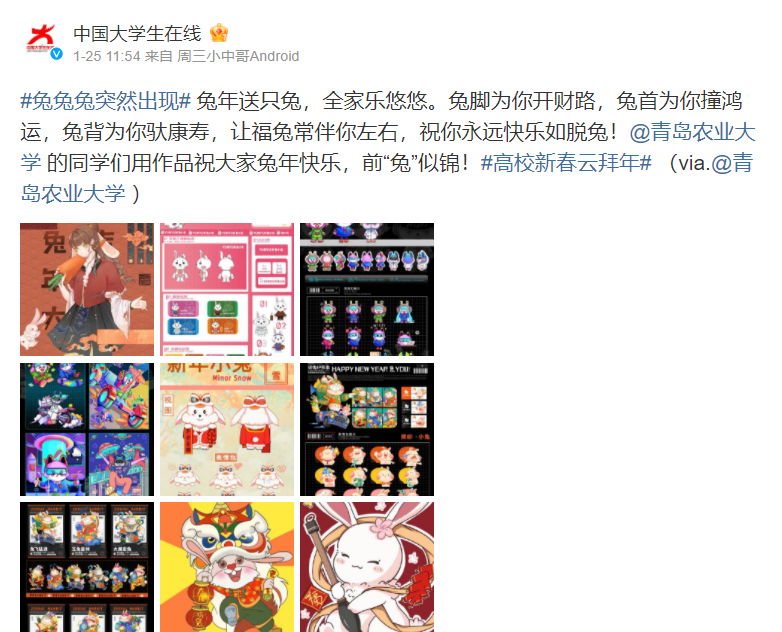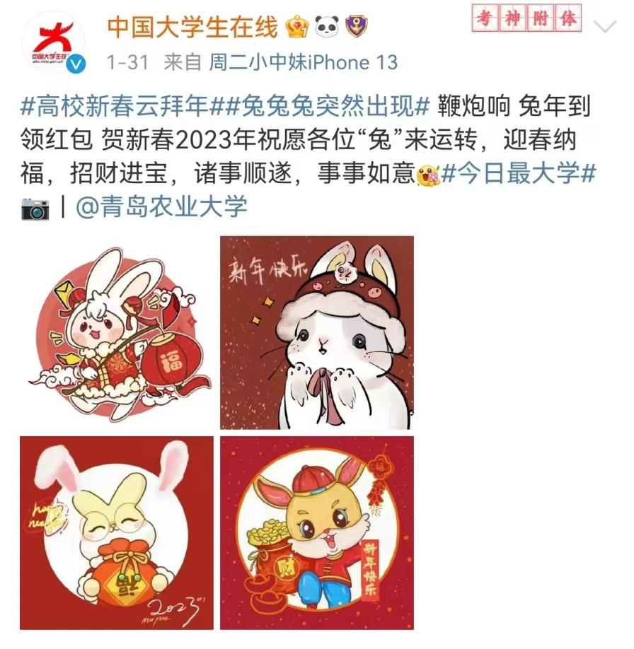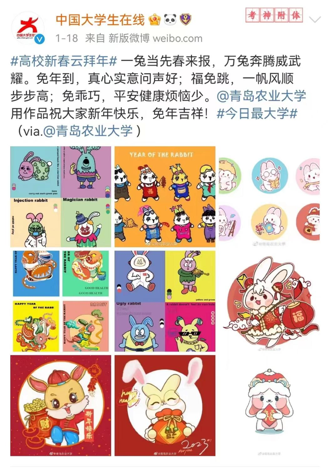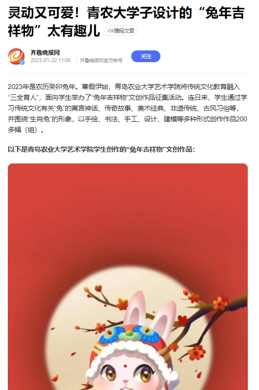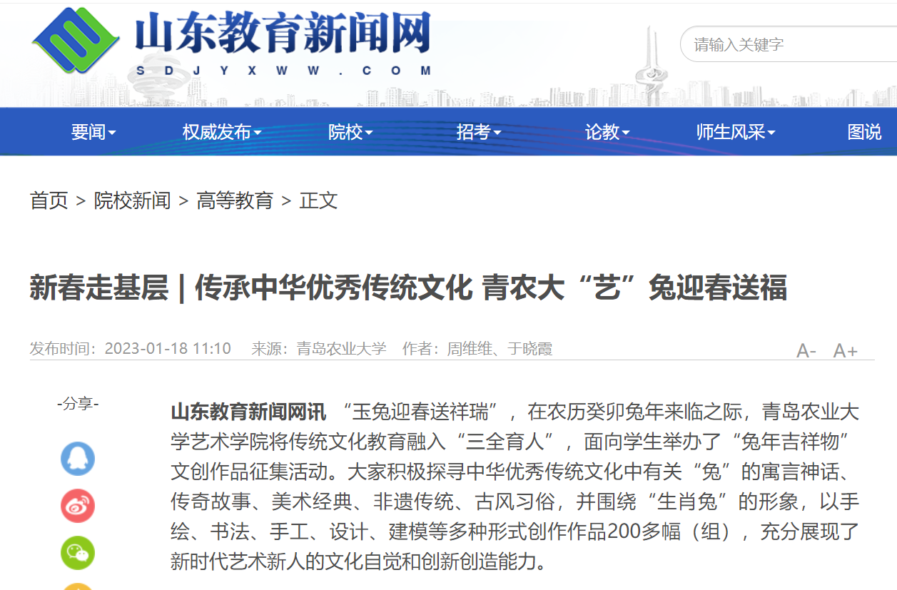 前“兔”似锦,玉兔迎春。寒假期间,韦德bevictor发挥专业优势,将传统文化教育融入“三全育人”,面向员工举办“兔年吉祥物”文创作品征集活动。同学们以多种多样的艺术形式展开创作,用精心创作的200多只可爱灵动的“小兔子”,在春节前夕送上新春祝福。在公司宣传部门大力支持下,多幅作品受到“中国教育新闻网”“大众网”、“山东教育新闻网”“齐鲁晚报网”、“齐鲁壹点”等媒体转发,并被学习强国等平台转载。相关内容在公司官方微博发布后,被中国老员工在线、山东校园新鲜事、青岛校园等多个教育类微博多次转发,将青岛农大艺术学子的新春祝福送到千家万户。