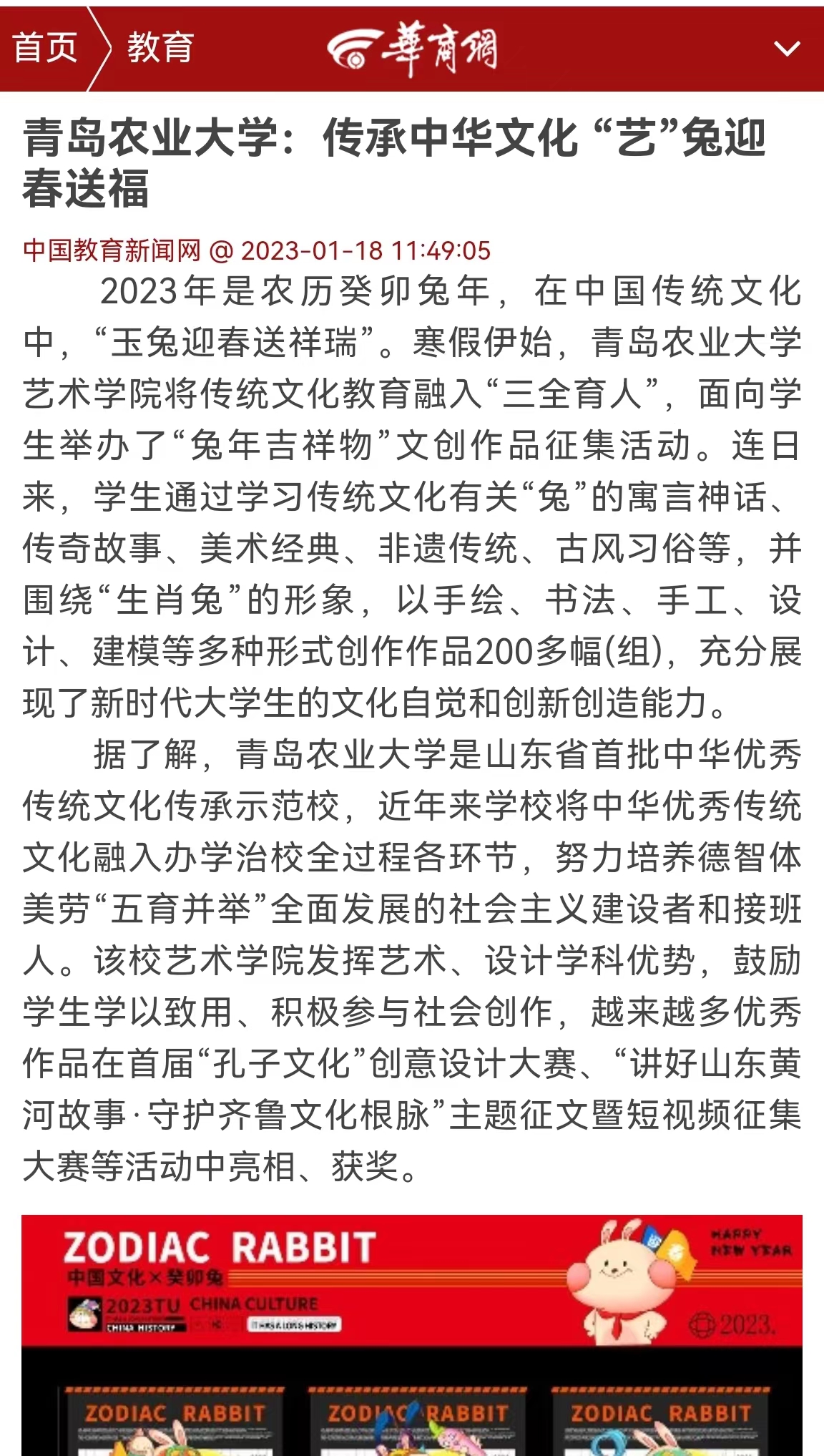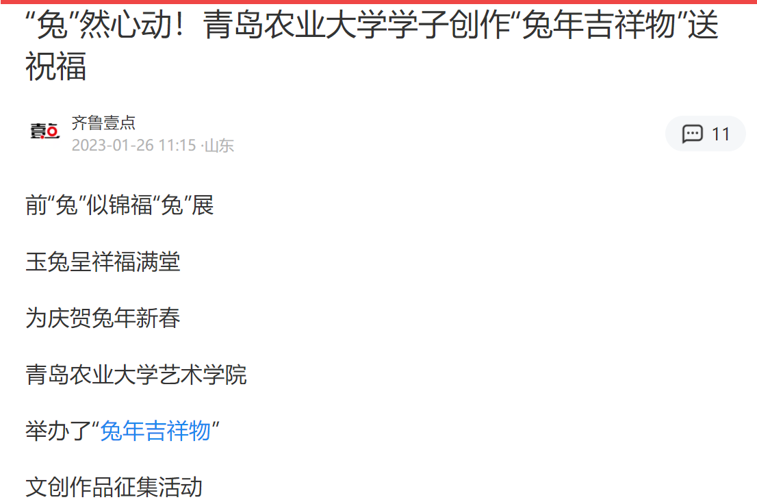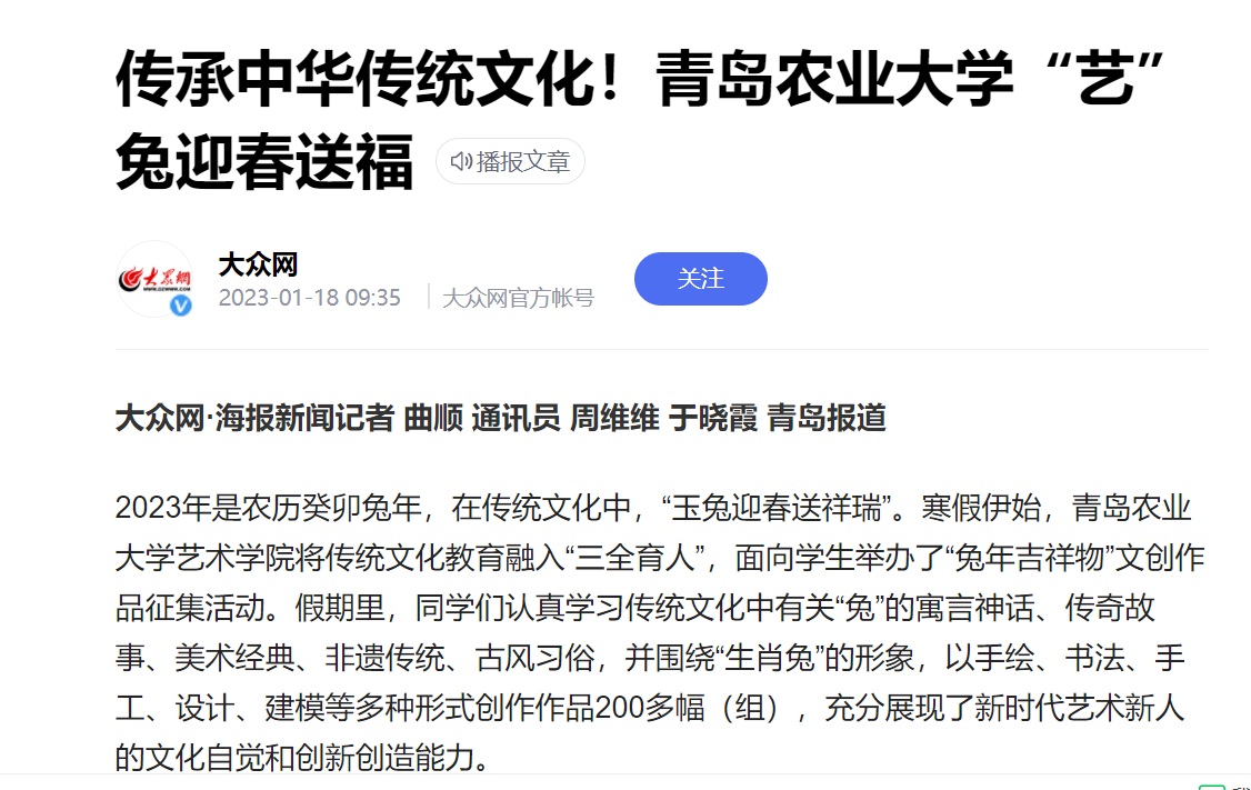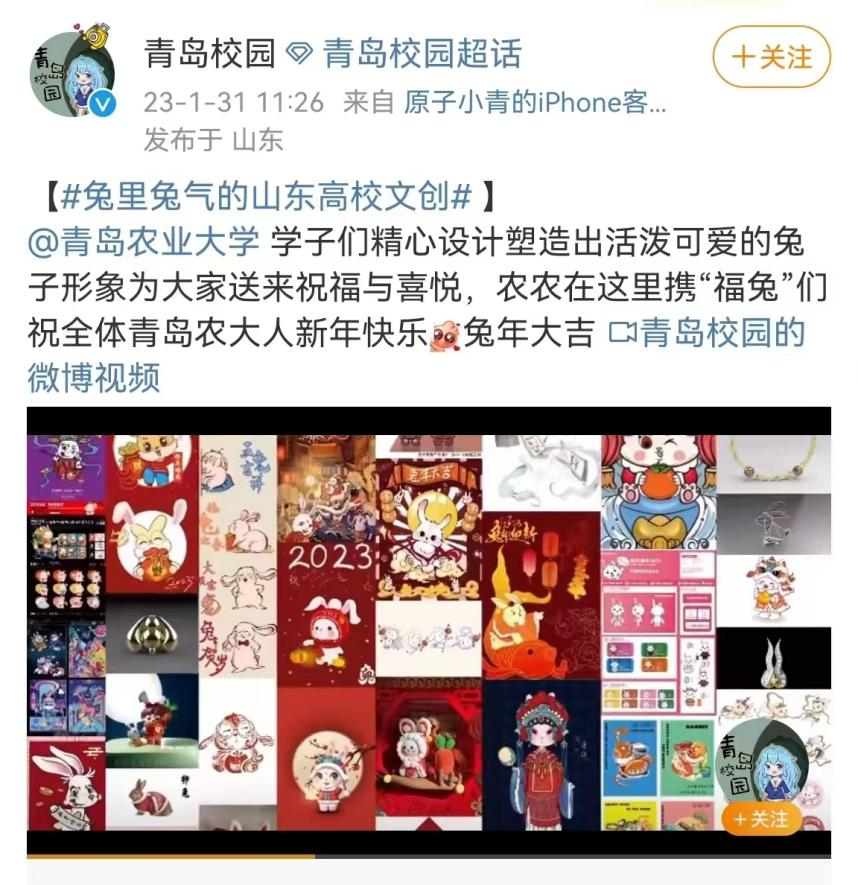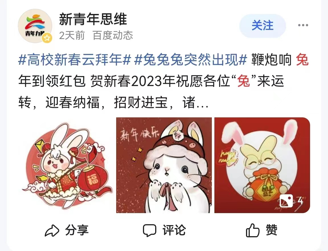 前“兔”似锦,玉兔迎春。寒假期间,韦德bevictor发挥专业优势,将传统文化教育融入“三全育人”,面向员工举办“兔年吉祥物”文创作品征集活动。同学们以多种多样的艺术形式展开创作,用精心创作的200多只可爱灵动的“小兔子”,在春节前夕送上新春祝福。在公司宣传部门大力支持下,多幅作品受到“中国教育新闻网”“大众网”、“山东教育新闻网”“齐鲁晚报网”、“齐鲁壹点”等媒体转发,并被学习强国等平台转载。相关内容在公司官方微博发布后,被中国老员工在线、山东校园新鲜事、青岛校园等多个教育类微博多次转发,将青岛农大艺术学子的新春祝福送到千家万户。