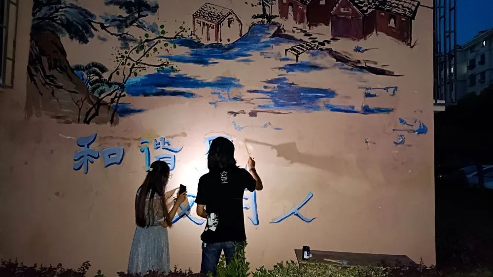 在投入创作之前,队员们与社区负责人进行充分地交流与沟通,采用彩绘图案和标语相结合的形式,体现和谐、诚信的主题。在这次墙绘实践中,队员们牺牲休息时间,斗高温、战酷暑,不惧蚊虫叮咬,不怕脏不怕累,充分发挥自身专业特长,团结协作,用一幅幅主题鲜明、风格各异的墙绘作品装点社区。或简或繁的图形填充丰富多彩的颜色,不仅美化了乡村,也将艺术融入乡村生活。在志愿者们的精心绘制下,生动别致的壁画跃然墙上,为新时代的美丽乡村带来了新气象、新风貌。