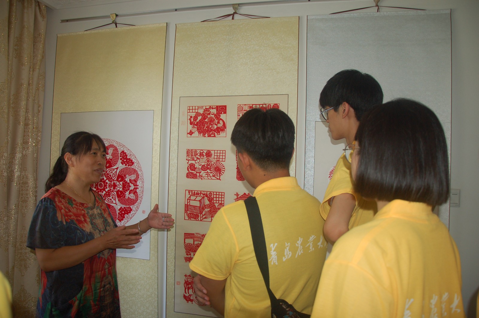 初入齐老师家,齐老师就热情的给同学们介绍了她的得意之作《女十忙》、《十二生肖》、《绣花嫁妆》等作品。齐秀芳告诉实践团的队员们,她自幼受家庭熏陶,酷爱剪纸,八岁跟姥姥学习剪纸,在姥姥的传承下保留了高密民间剪纸的独特风格。她的剪纸在传统的剪纸技法基础上,进行大胆丰富和创新,对比强烈富有韵律,线条挺拔浑厚,且粗犷不呆板,散发出浓厚的乡土气息和厚重的中国传统文化底蕴,反映了潍坊人民朴素的道德观念、纯真的生活情趣和幽默感。