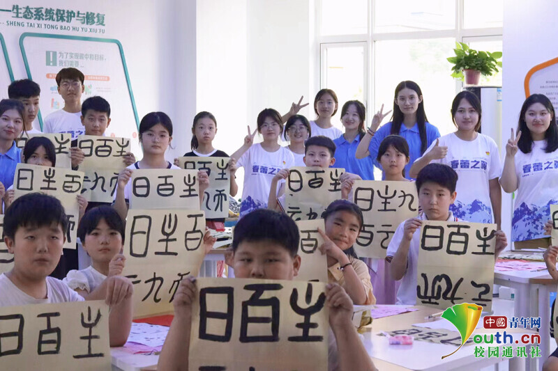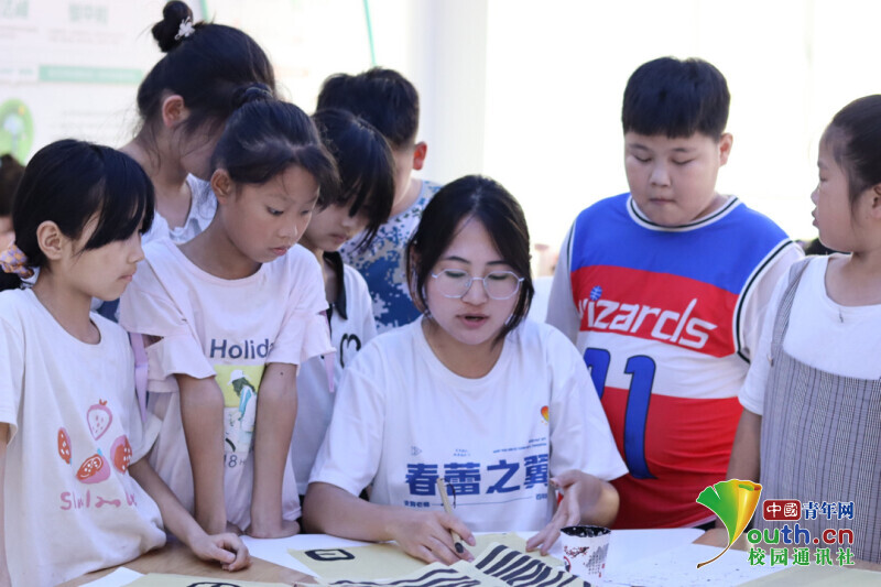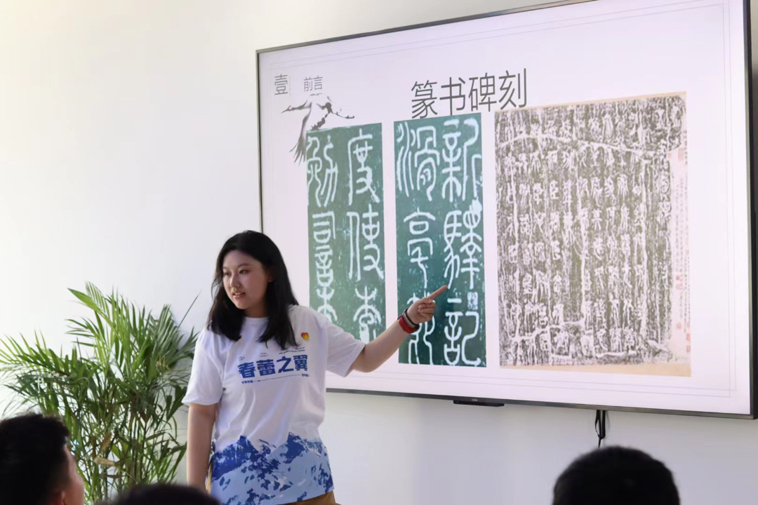 课堂上,两位“小老师”耐心指正孩子们的握笔姿势,并传授给他们基本的书法笔画、规范的字体结构与汉字的书写技巧。孩子们专注聆听、认真学习,一双双炯炯有神的眼睛满怀对知识的渴望与热情。怀揣着对中华传统文化的热爱与传承使命感,志愿者丁梦分享此次支教的感悟,“书法与汉字都是中国的文化符号,看着孩子们对咱们的传统文化感兴趣,从下笔生疏到能流利地写出浑圆的小篆字体,这样的快乐难以形容,我想,这就是教育的意义。”