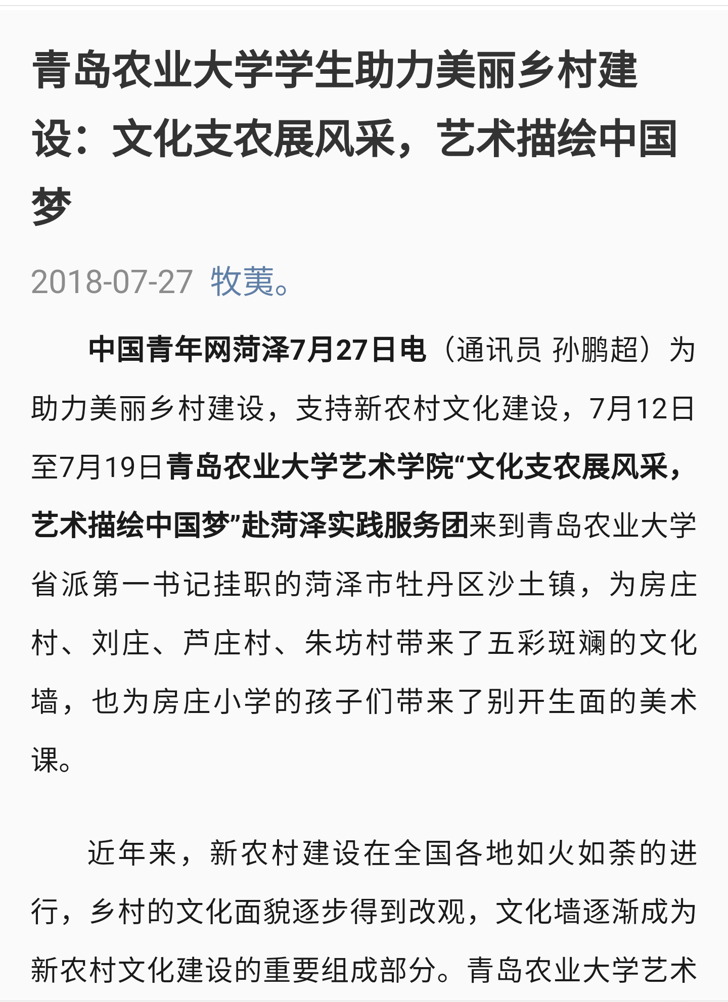 中国青年网菏泽7月27日电(通讯员 孙鹏超)为助力美丽乡村建设,支持新农村文化建设,7月12日至7月19日韦德bevictor“文化支农展风采,艺术描绘中国梦”赴菏泽实践服务团来到韦德bevictor官网省派第一书记挂职的菏泽市牡丹区沙土镇,为房庄村、刘庄、芦庄村、朱坊村带来了五彩斑斓的文化墙,也为房庄小学的孩子们带来了别开生面的美术课。