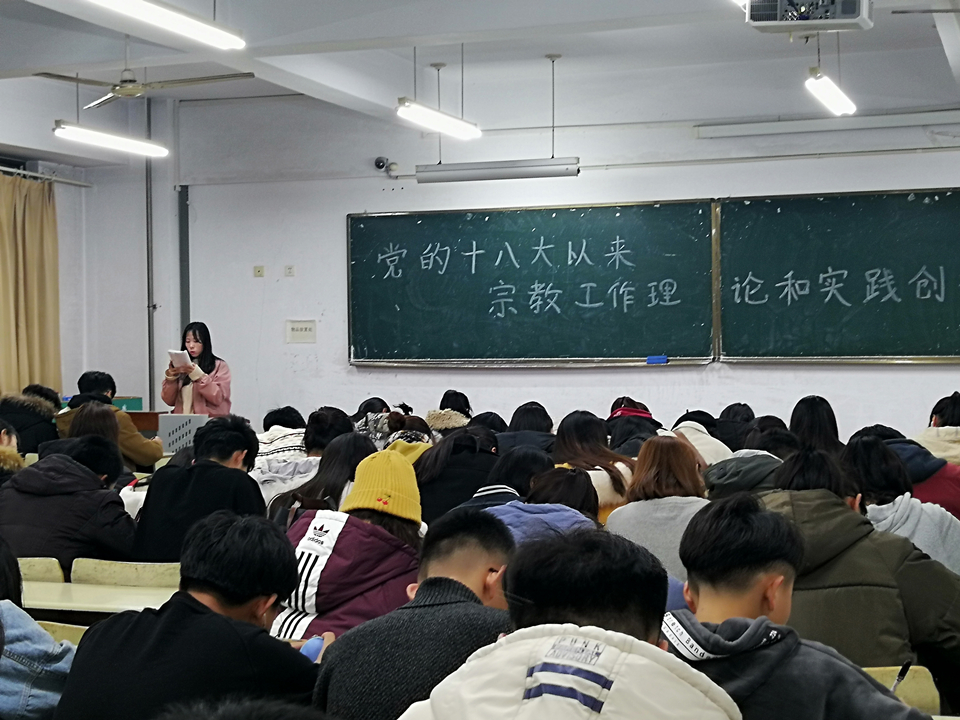 各班级团支书领学了党的十八大以来的宗教工作理论与创新实践内容,通过学习习近平总书记指出的“做好党的宗教工作,把党的宗教工作基本方针坚持好,关键是要在‘导’上想得深、看得透、把得准,做到‘导’之有方、‘导’之有力、‘导’之有效,牢牢掌握宗教工作主动权”这一重要论述,纠正了同学们看待宗教问题的各种错误,使同学了解了宗教工作的重要性。学习过程中,同学们积极配合,热情讨论,加深了对于宗教问题的理解。
