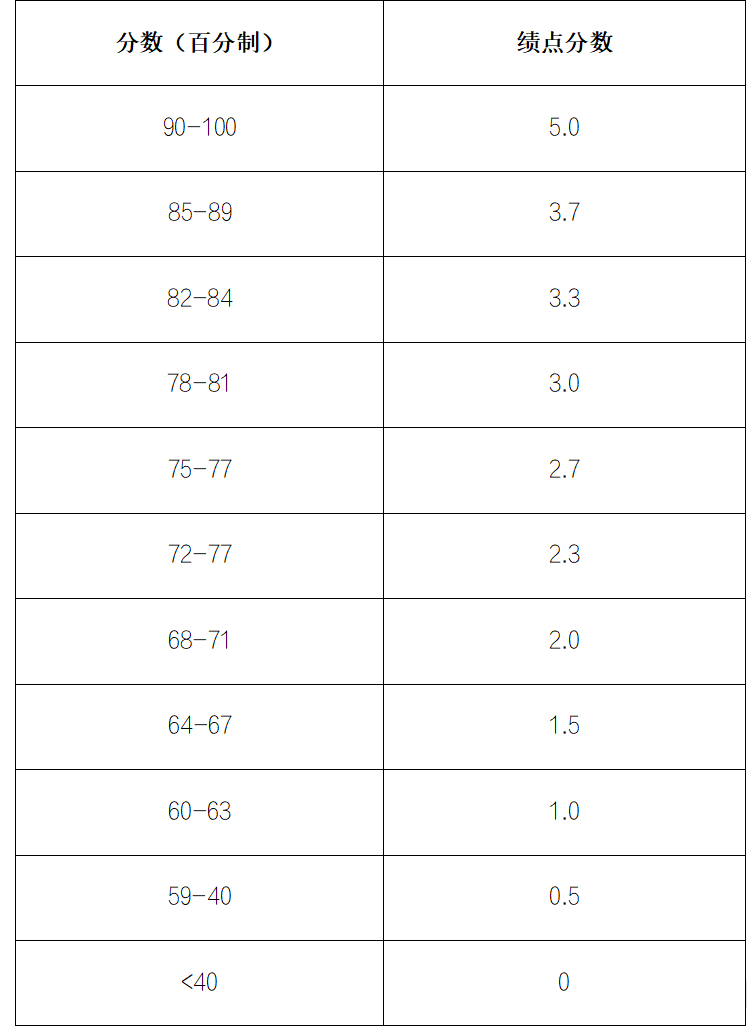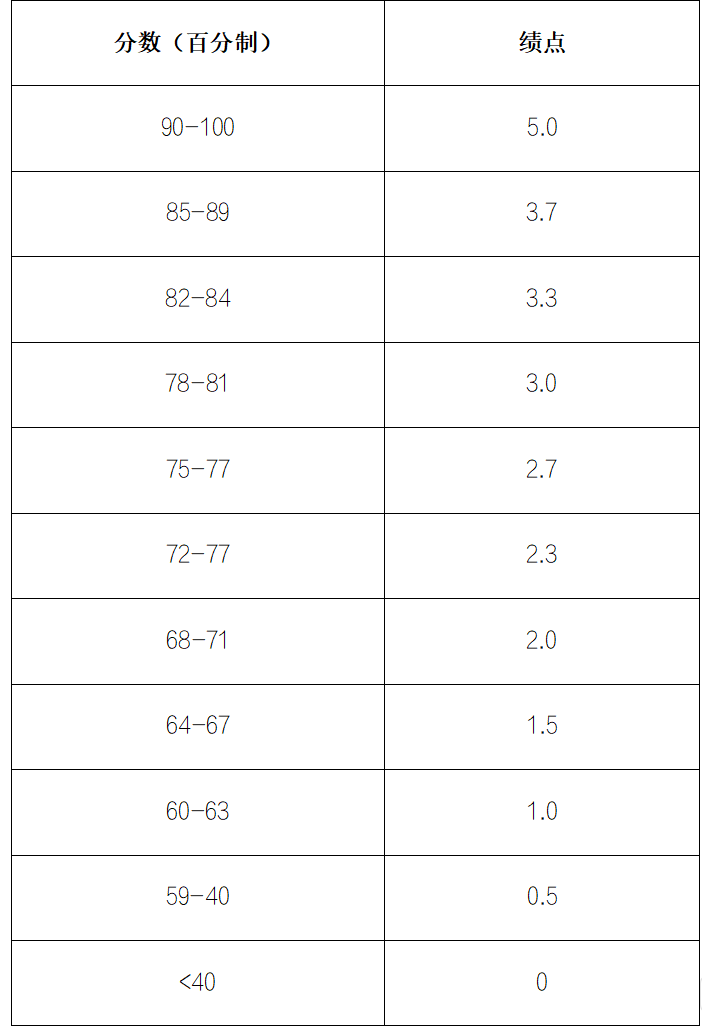 标准分加权计算得到百分制分数,换算为绩点分数,具体换算如下表。