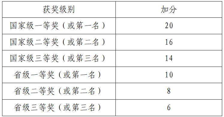 5.未设立一、二、三等奖的竞赛,按名次确定加分,第一名认定为一等奖,第二名认定为二等奖,第三名认定为三等奖,其它名次均不加分。优秀奖不加分。未设置特等奖的,一等奖按特等奖加分,其它不变。