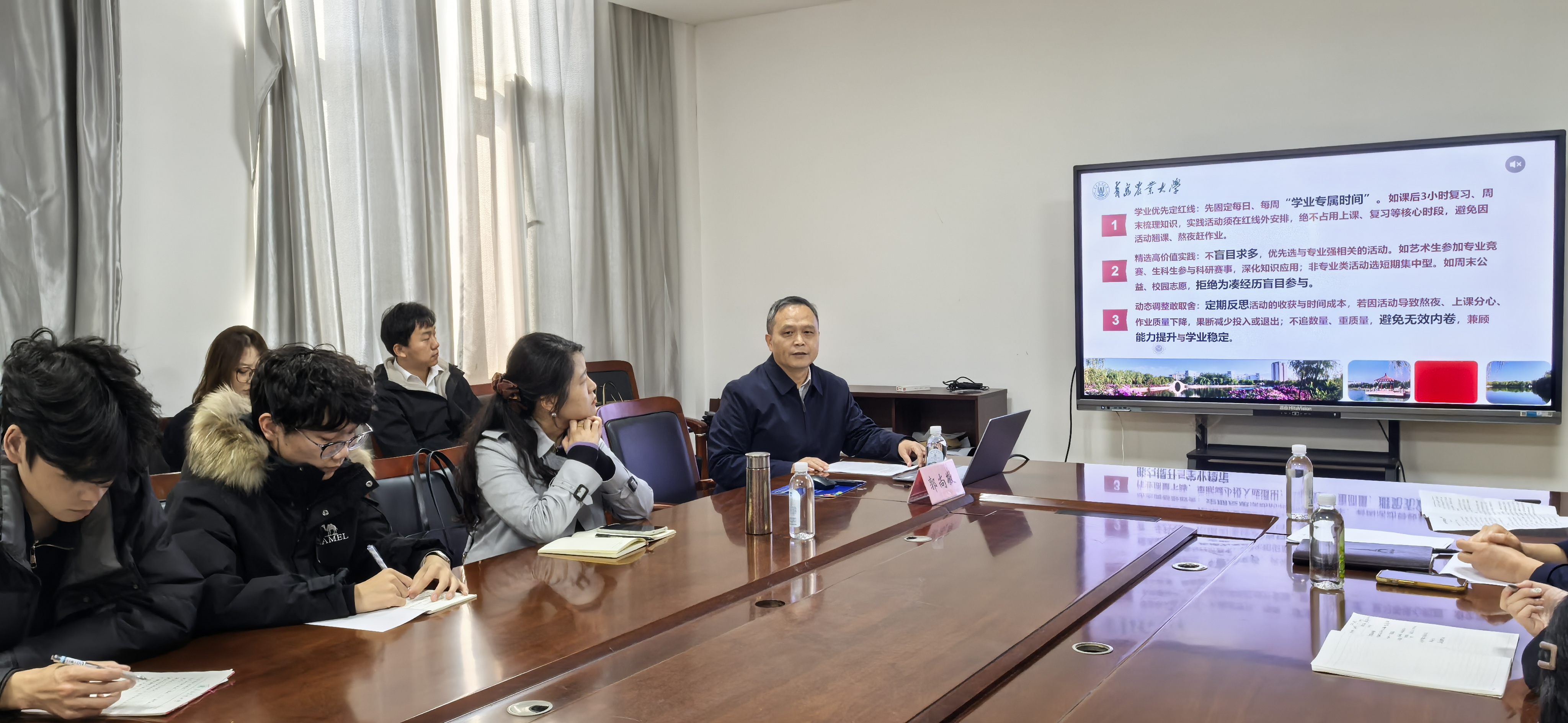 10 月 23 日下午,副董事长郭尚敬在平度校区为2025级新生讲授开学第一课。公司党委书记王天龙主持会议,公司党委副书记、副经理周维维,辅导员白芳及2025级新生代表参加了学习。